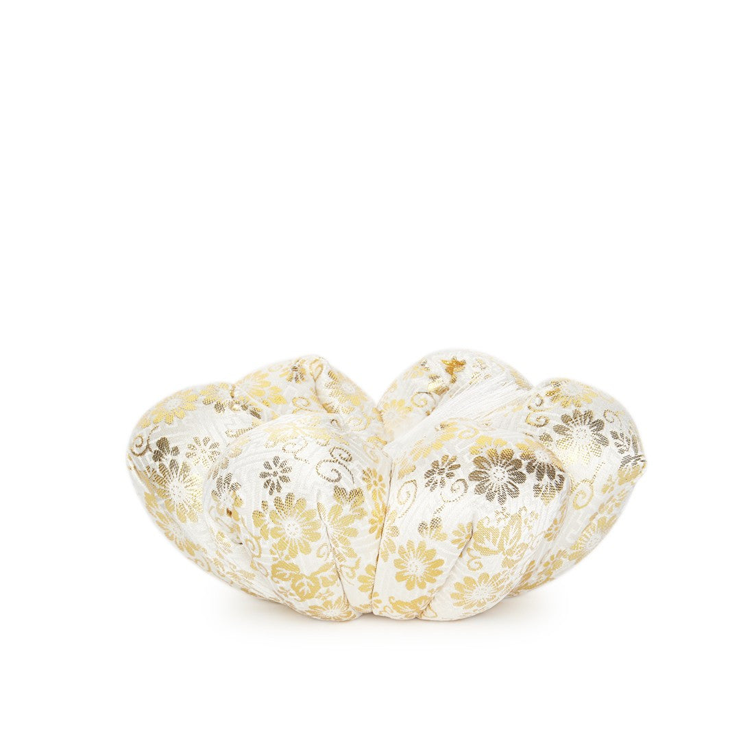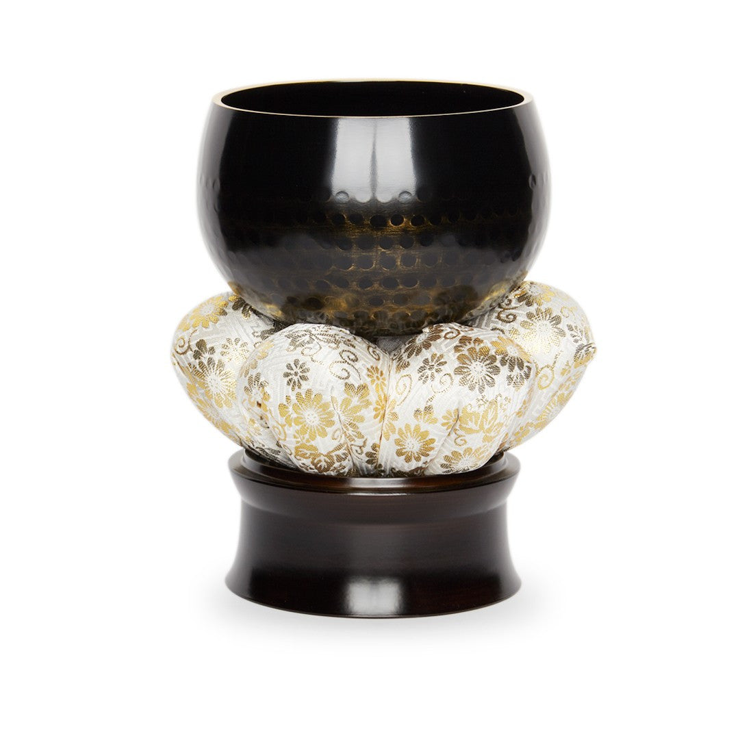 Cuscino imbottito foderato in tessuto bianco e decorato a fiori con fili dorati. La sua forma gli consente di accogliere perfettamente la campana da 15 cm. e per essere posizionato sulla relativa base (questi articoli sono venduti separatamente). Fabbricato in Giappone, dal classico design orientale riconoscibile dalle decorazioni in filo dorato su stoffa bianca.