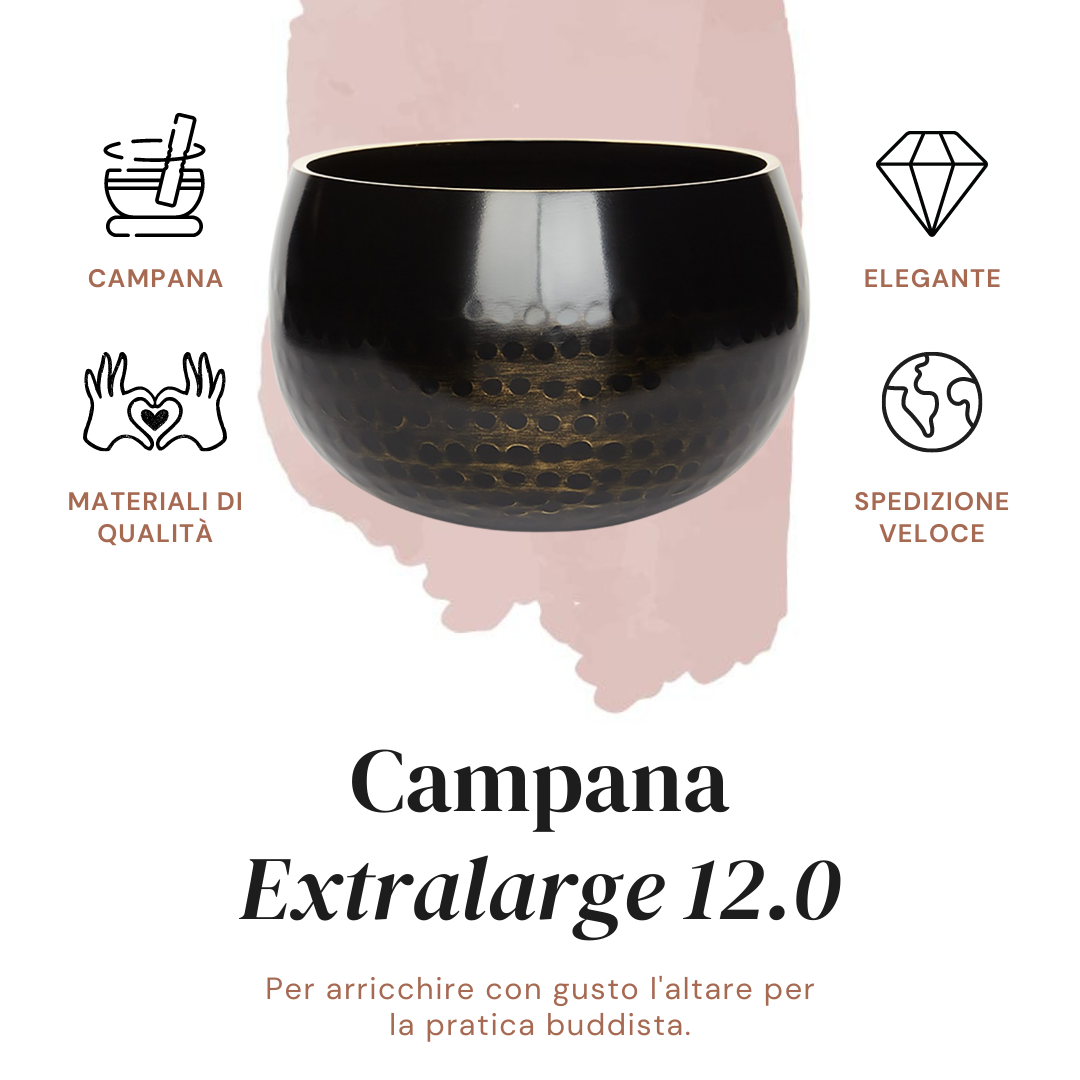 Extralarge copper bell made in Japan. In addition to being an essential accessory for the altar dedicated to daily practice, this format is also a fine piece of furniture and offers a harmonious and full sound. You will be able to purchase the bell separately from the other products that make up the set. It can be shipped anywhere in Europe; total costs will be given after you indicate the destination address