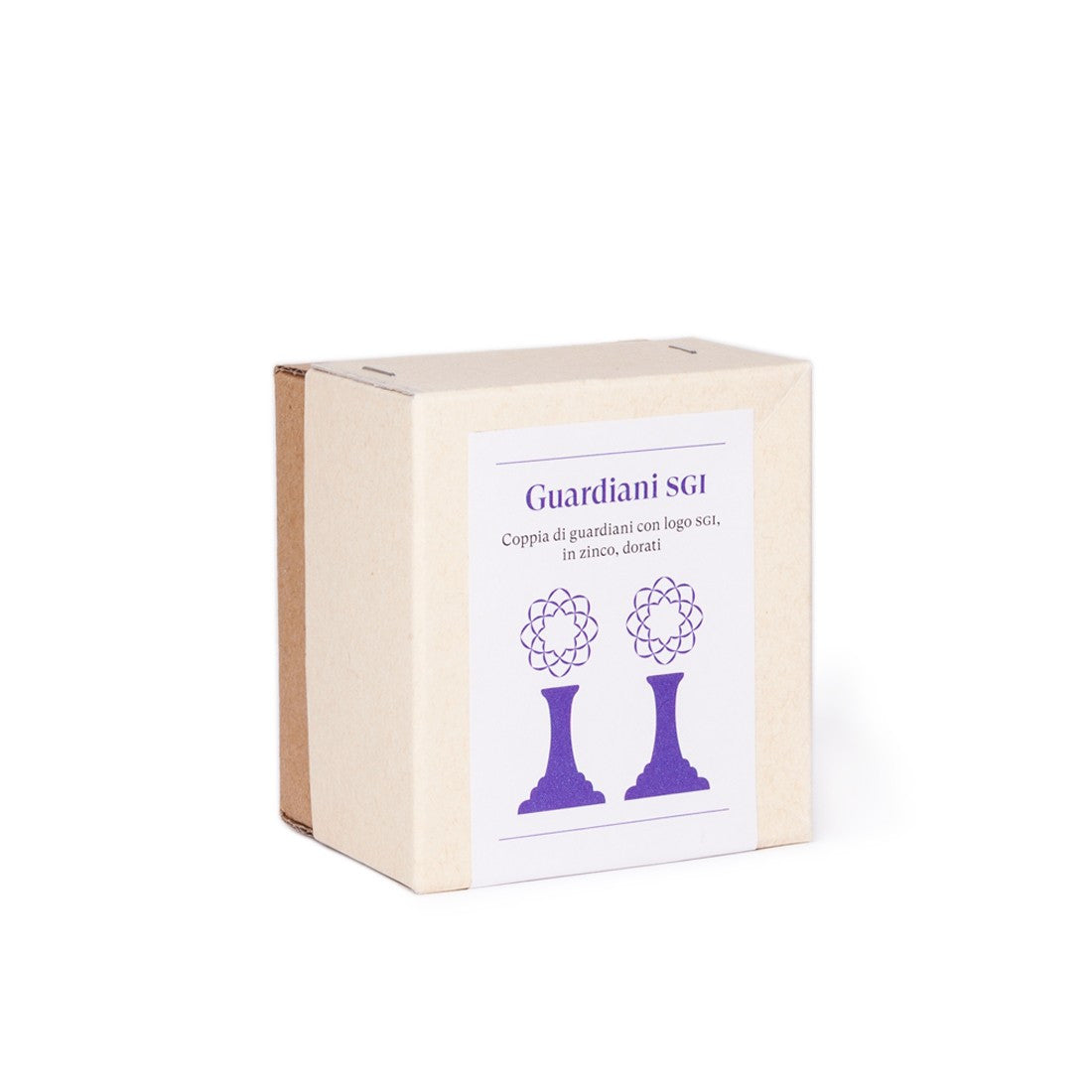 Pair of classic guardians with SGI logo, made of zinc, to be placed in the butsudan, for protection of the Gohonzon.