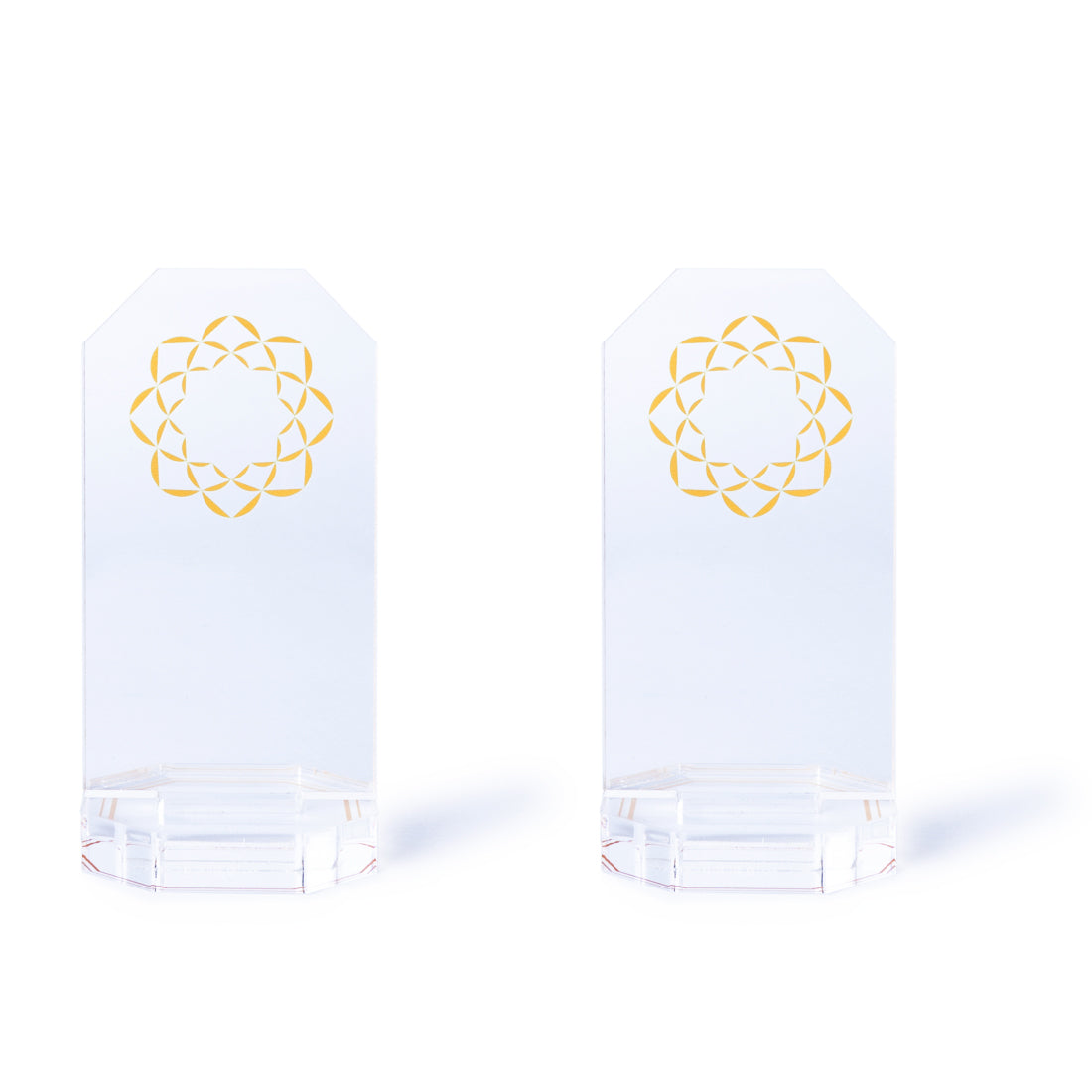 Set di due guardiani di dimensioni ridotte, realizzati in plastica trasparente e impreziositi dal logo SGI dorato, progettati per essere posizionati nel butsudan a tutela del Gohonzon.