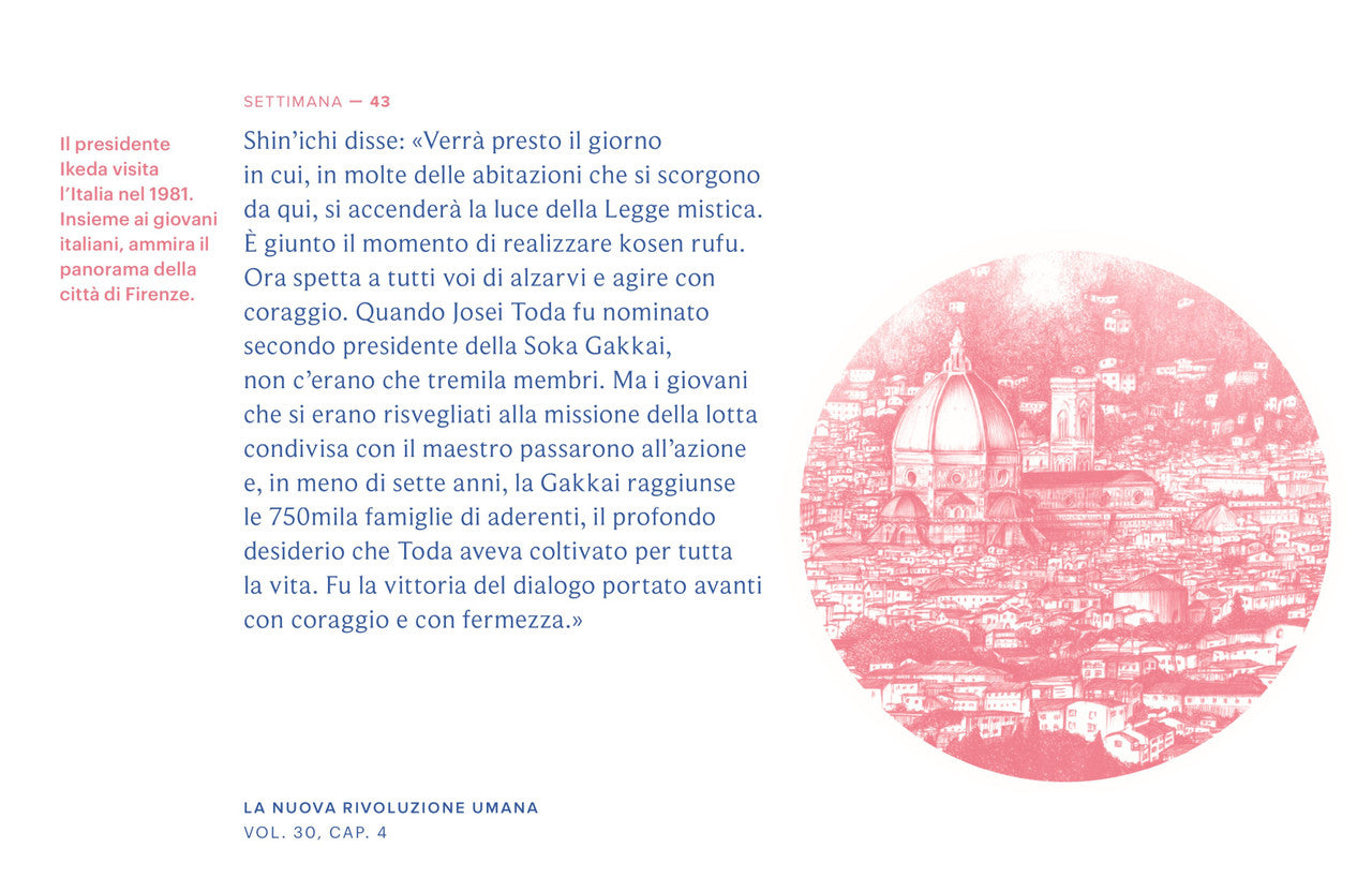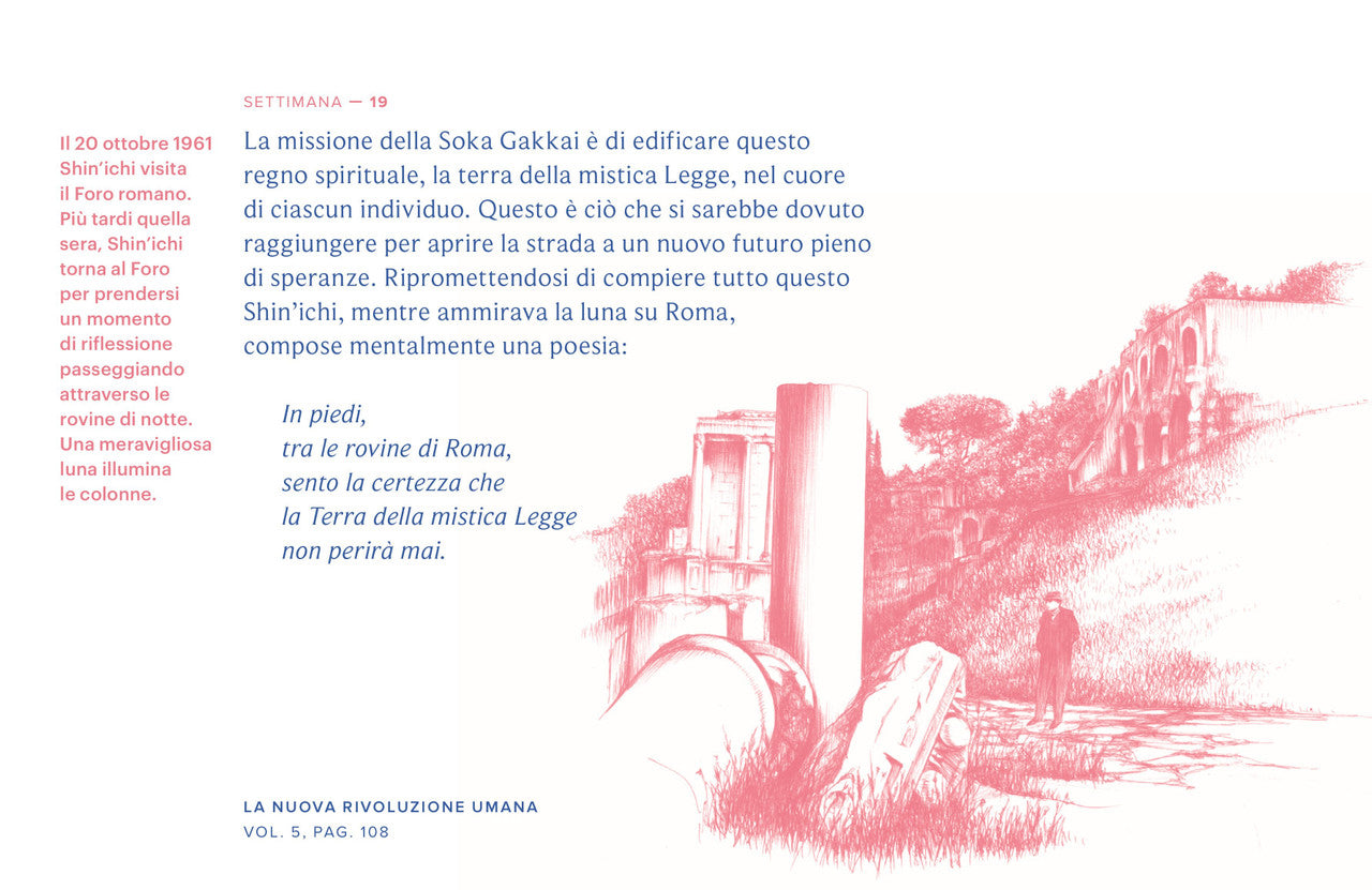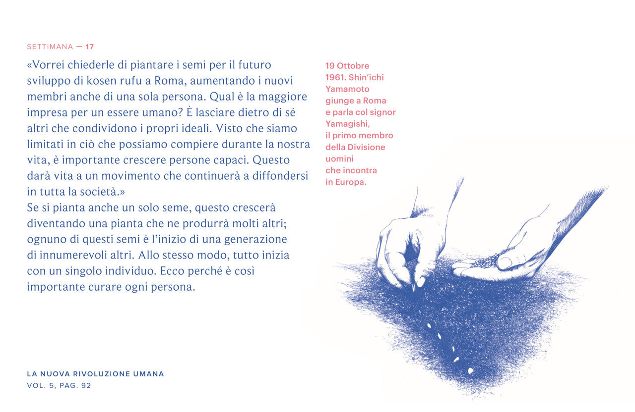 Uno splendido calendario da tavolo illustrato con passi scelti dalla Nuova rivoluzione umana. Prodotto da tavolo contenente cinquantadue passi, uno per ogni settimana dell’anno, accompagnati da splendide illustrazioni di Giuliana Gusmini. La selezione abbraccia l’intera opera e offre ai membri una piacevole occasione per scoprire gli incoraggiamenti presenti nella Nuova rivoluzione umana, fornendo uno spunto per l’approfondimento del romanzo.