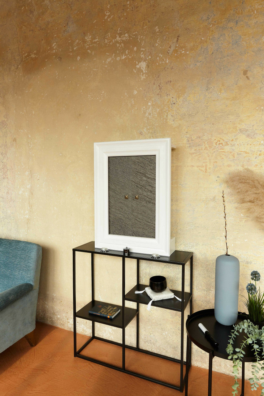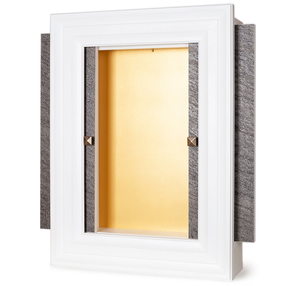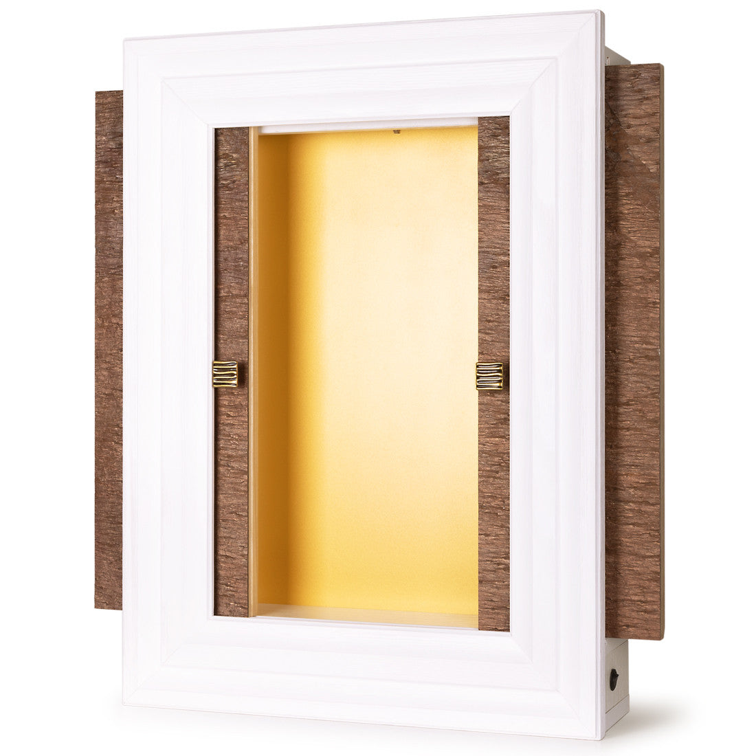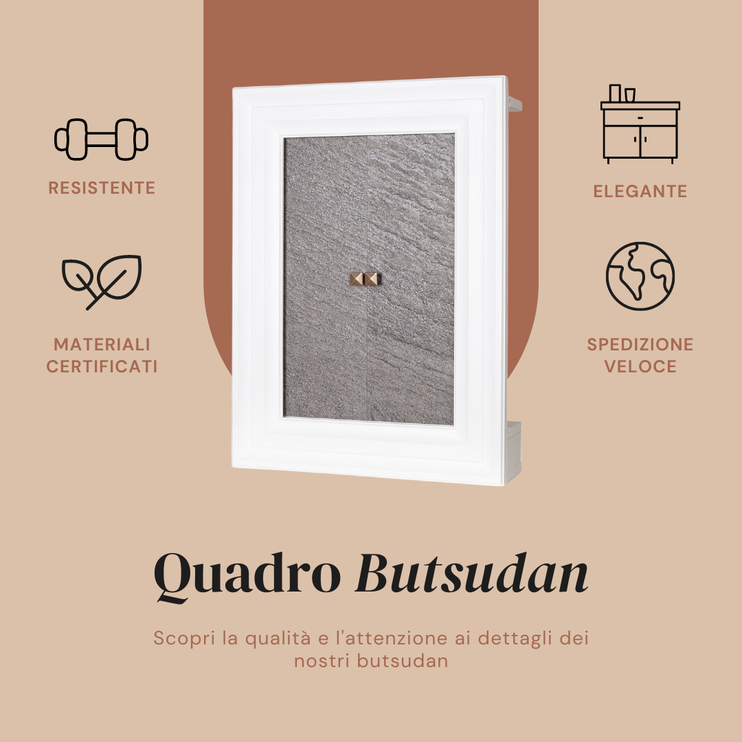 Butsudan prodotto artigianalmente in Italia. L'elegante design ricorda una cornice, arricchito da preziose ante scorrevoli in pietra. È dotato di luce interna e può accogliere il Tokuso.