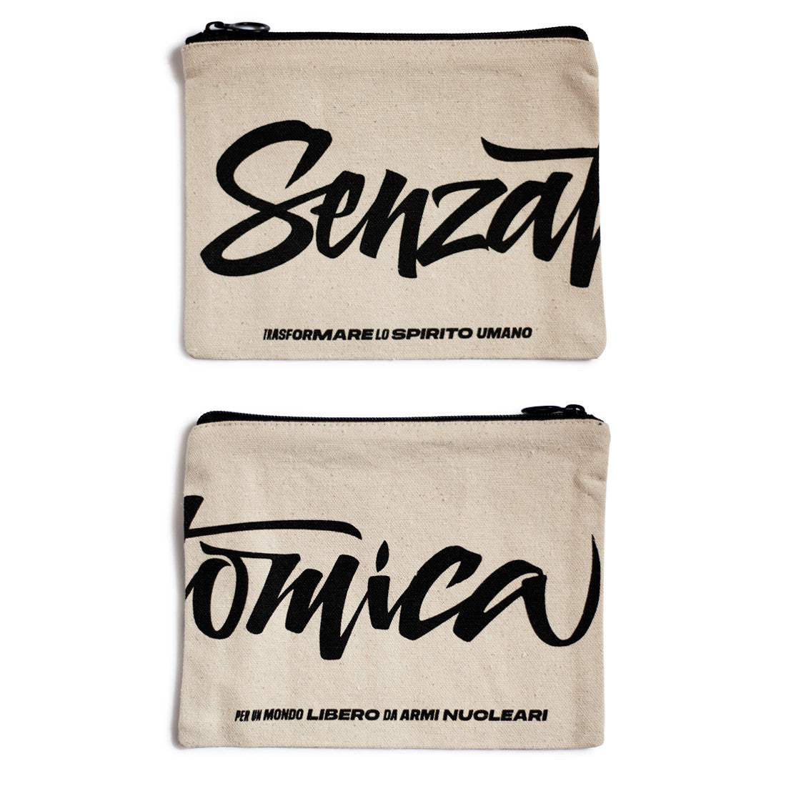 L'astuccio raffigura il logo della Mostra SENZATOMICA esteso su entrambi i lati della borsa. Ad arricchire la borsa è presente su entrambi i lati della borsa il claim della mostra: "Trasformare lo spirito umano per un mondo libero dalle armi nucleari".